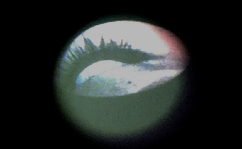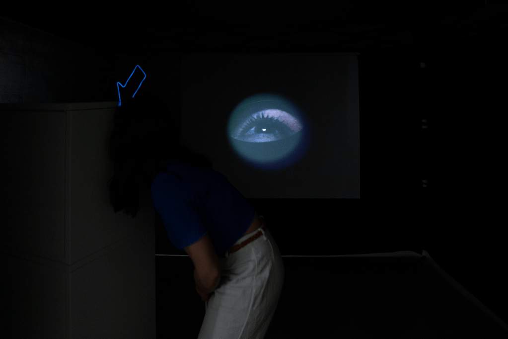 Además, sin pedir permiso, para que no haya escapatoria, la imagen del ojo del espectador es capturada y proyectada en una pantalla, volviéndose espectáculo. Este mecanismo sorpresivo impide que el voyeur pueda ver su ojo proyectado en la pantalla y el interior de la caja al mismo tiempo, por lo que para ver la obra al completo se necesita la participación de un otro que se convierta, una vez más, en voyeur de toda la escena, y que luego esté dispuesto a cambiar de lugar.